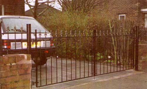 These gates use old style spear head, ref 04/28. they also incorporate a second row of uprights known as doggy bars to keep in pets. They are 5000mm wide/ 1800mm high.